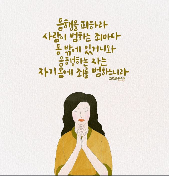 18. 음행을 피하라 사람이 범하는 죄마다 몸 밖에 있거니와 음행하는 자는 자기 몸에 죄를 범하느니라