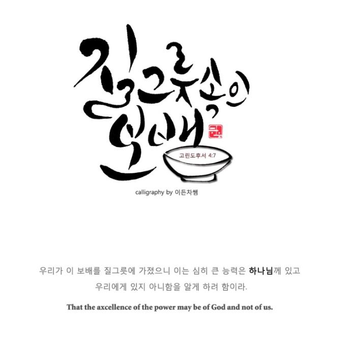 - 우리가 이 보배를 질그릇에 가졌으니 이는 심히 큰 능력은 하나님께 있고 우리에게 있지 아니함을 알게 하려 함이라