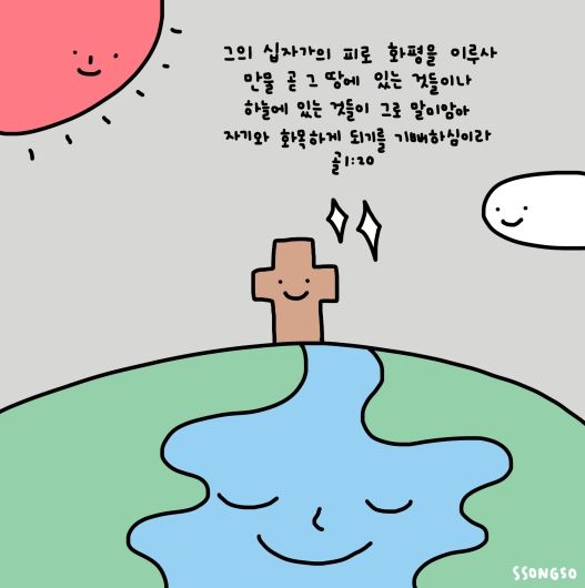 - 그의 십자가의 피로 화평을 이루사 만물 곧 땅에 있는 것들이나 하늘에 있는 것들이 그로 말미암아 자기와 화목하게 되기를 기뻐하심이라