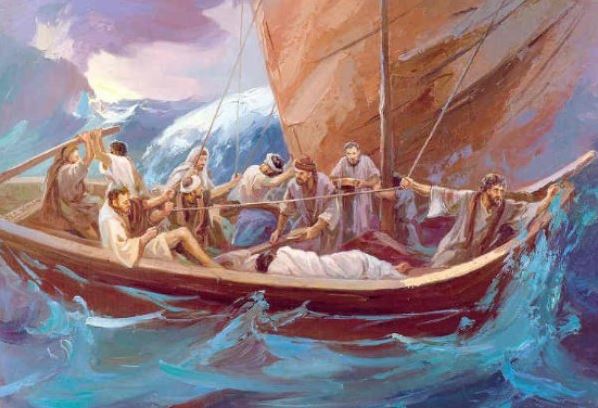 - 행선할 때에 예수께서 잠이 드셨더니 마침 광풍이 호수로 내리치매 배에 물이 가득하게 되어 위태한지라