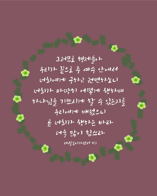 - 그러므로 형제들아 우리가 끝으로 주 예수 안에서 너희에게 구하고 권면하노니 너희가 마땅히 어떻게 행하며 하나님을 기쁘시게 할 수 있는지를 우리에게 배웠으니 곧 너희가 행하는 바라 더욱 많이 힘쓰라