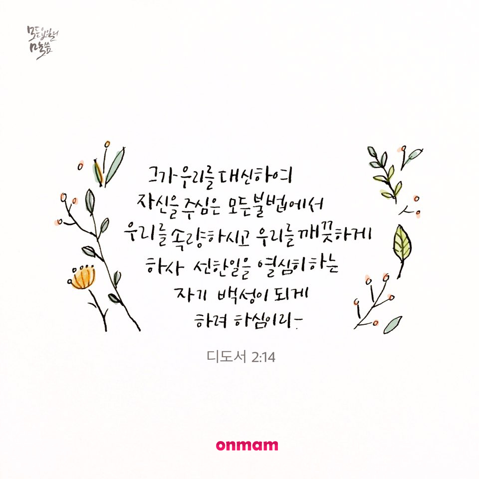 - 그가 우리를 대신하여 자신을 주심은 모든 불법에서 우리를 속량하시고 우리를 깨끗하게 하사 선한 일을 열심히 하는 자기 백성이 되게 하려 하심이라