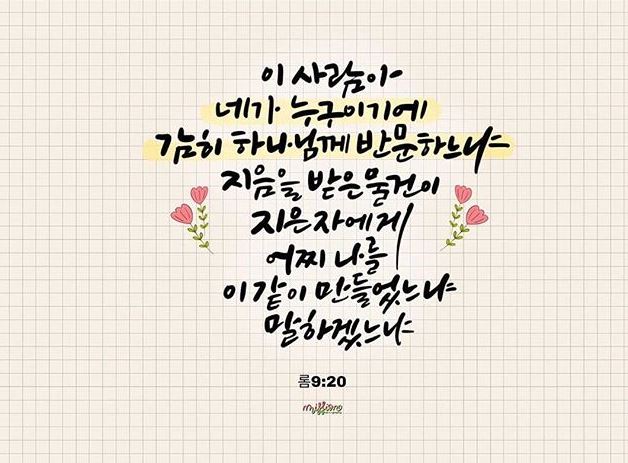- 이 사람아 네가 누구이기에 감히 하나님께 반문하느냐 지음을 받은 물건이 지은 자에게 어찌 나를 이같이 만들었느냐 말하겠느냐