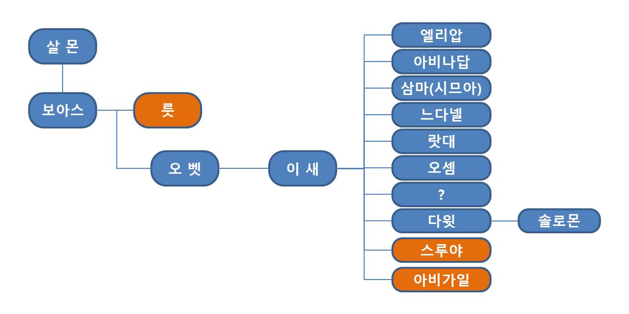 - 살몬은 보아스를 낳았고 보아스는 오벳을 낳았고