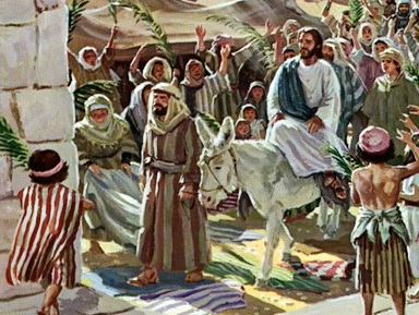 - 무리의 대다수는 그들의 겉옷을 길에 펴고 다른 이들은 나뭇가지를 베어 길에 펴고