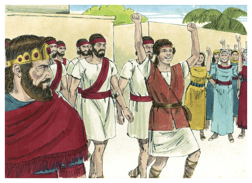 - 무리가 돌아올 때 곧 다윗이 블레셋 사람을 죽이고 돌아올 때에 여인들이 이스라엘 모든 성읍에서 나와서 노래하며 춤추며 소고와 경쇠를 가지고 왕 사울을 환영하는데