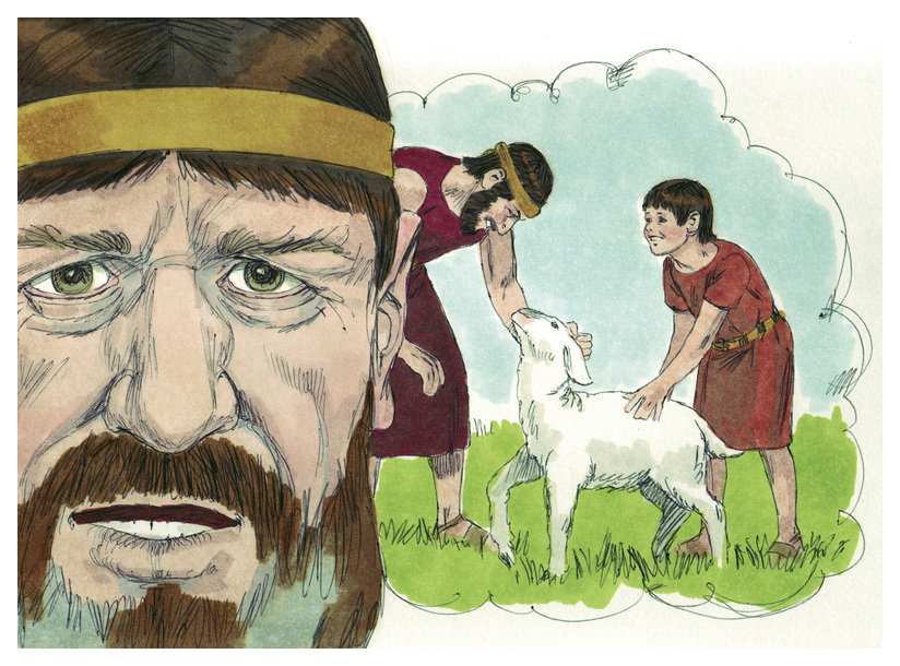 - 가난한 사람은 아무것도 없고 자기가 사서 기르는 작은 암양 새끼 한 마리뿐이라 그 암양 새끼는 그와 그의 자식과 함께 자라며 그가 먹는 것을 먹으며 그의 잔으로 마시며 그의 품에 누우므로 그에게는 딸처럼 되었거늘