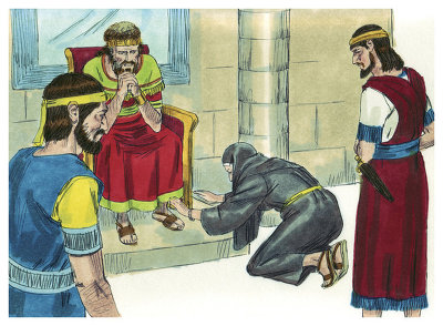 요압은 하나밖에 남지 않은 아들을 마지막 불씨에 비유한 여인의 이야기를 통해 율법의 두가지 규정을 인위적으로 상충시켜 다윗이 압살롬을 용서할 명분을 제시하려 햇다. 율법에는 피의 복수법과 한 가문의 대와 이름이 끊기는 것을 방지하는 법이 있었다. 결국 다윗 왕은 암논의 피에 대한 복수로 알살롬을 죽여야 했지만, 장차 왕위를 이을 자였던 그를 제거할 수 없었다.