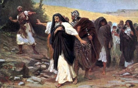 - 다윗과 그의 추종자들이 길을 갈 때에 시므이는 산비탈로 따라가면서 저주하고 그를 향하여 돌을 던지며 먼지를 날리더라