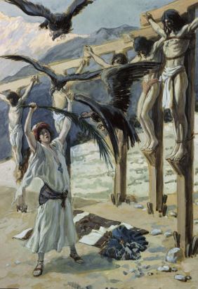 - 아야의 딸 리스바가 굵은 베를 가져다가 자기를 위하여 바위 위에 펴고 곡식 베기 시작할 때부터 하늘에서 비가 시체에 쏟아지기까지 그 시체에 낮에는 공중의 새가 앉지 못하게 하고 밤에는 들짐승이 범하지 못하게 한지라