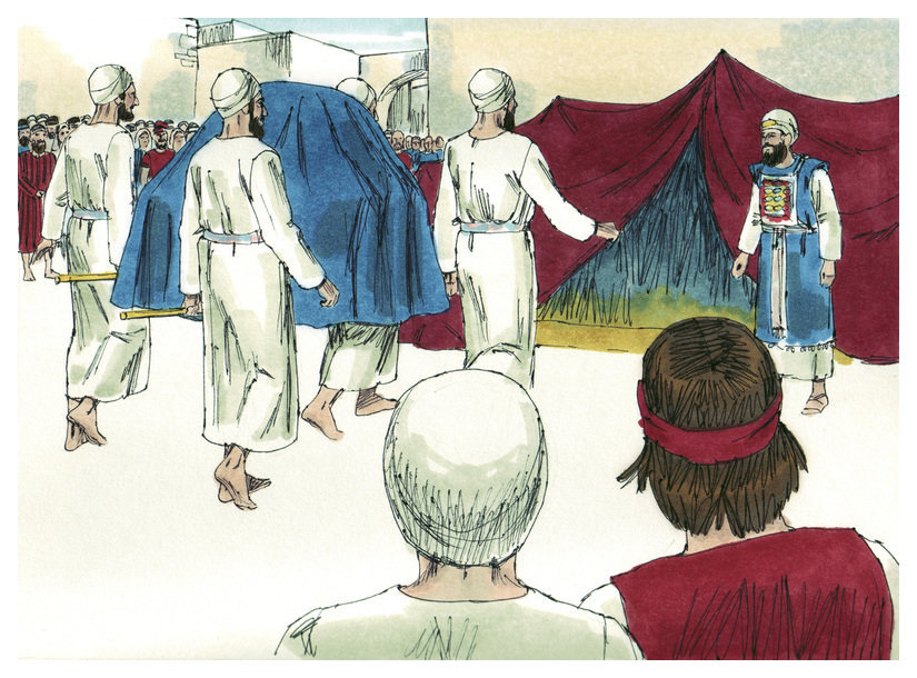 - 다윗과 온 이스라엘 족속이 즐거이 환호하며 나팔을 불고 여호와의 궤를 메어오니라