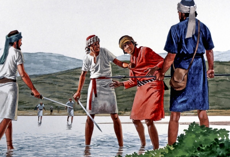 - 길르앗 사람이 에브라임 사람보다 앞서 요단 강 나루턱을 장악하고 에브라임 사람의 도망하는 자가 말하기를 청하건대 나를 건너가게 하라 하면 길르앗 사람이 그에게 묻기를 네가 에브라임 사람이냐 하여 그가 만일 아니라 하면