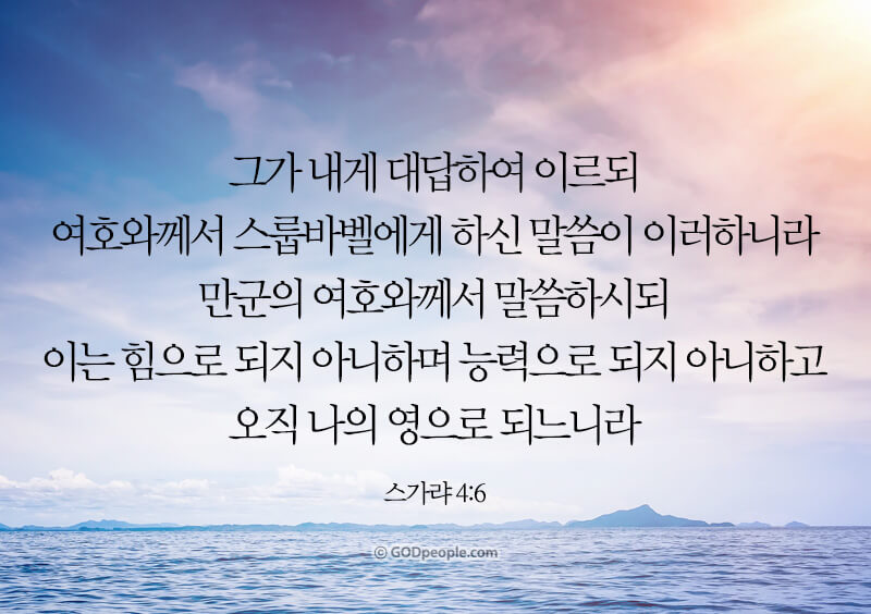 - 그가 내게 대답하여 이르되 여호와께서 스룹바벨에게 하신 말씀이 이러하니라 만군의 여호와께서 말씀하시되 이는 힘으로 되지 아니하며 능력으로 되지 아니하고 오직 나의 영으로 되느니라
