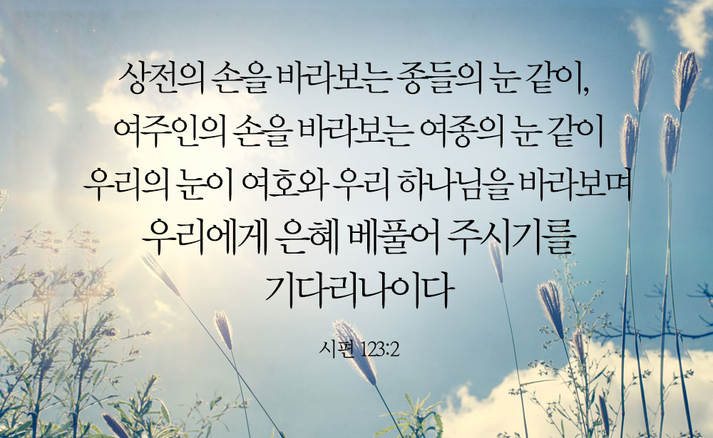 상전의 손을 바라보는 종들의 눈 같이, 여주인의 손을 바라보는 여종의 눈 같이 우리의 눈이 여호와 우리 하나님을 바라보며 우리에게 은혜 베풀어 주시기를 기다리나이다