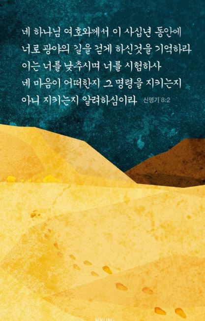 - 네 하나님 여호와께서 이 사십 년 동안에 네게 광야 길을 걷게 하신 것을 기억하라 이는 너를 낮추시며 너를 시험하사 네 마음이 어떠한지 그 명령을 지키는지 지키지 않는지 알려 하심이라