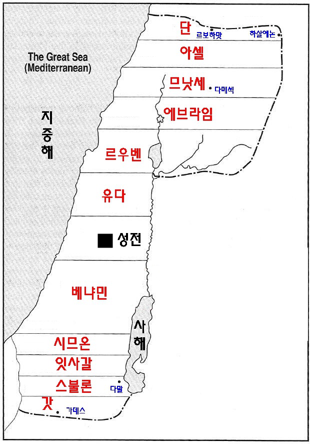 - 단 경계선 다음으로 동쪽에서 서쪽까지는 아셀의 몫이요