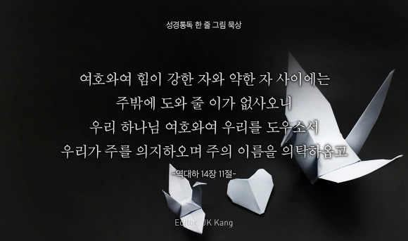 11. 아사가 그의 하나님 여호와께 부르짖어 이르되 여호와여 힘이 강한 자와 약한 자 사이에는 주밖에 도와 줄 이가 없사오니 우리 하나님 여호와여 우리를 도우소서 우리가 주를 의지하오며 주의 이름을 의탁하옵고 이 많은 무리를 치러 왔나이다 여호와여 주는 우리 하나님이시오니 원하건대 사람이 주를 이기지 못하게 하옵소서 하였더니
