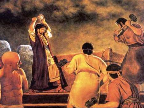 - 제사 드리기를 마치매 왕과 그와 함께 있는 자들이 다 엎드려 경배하니라