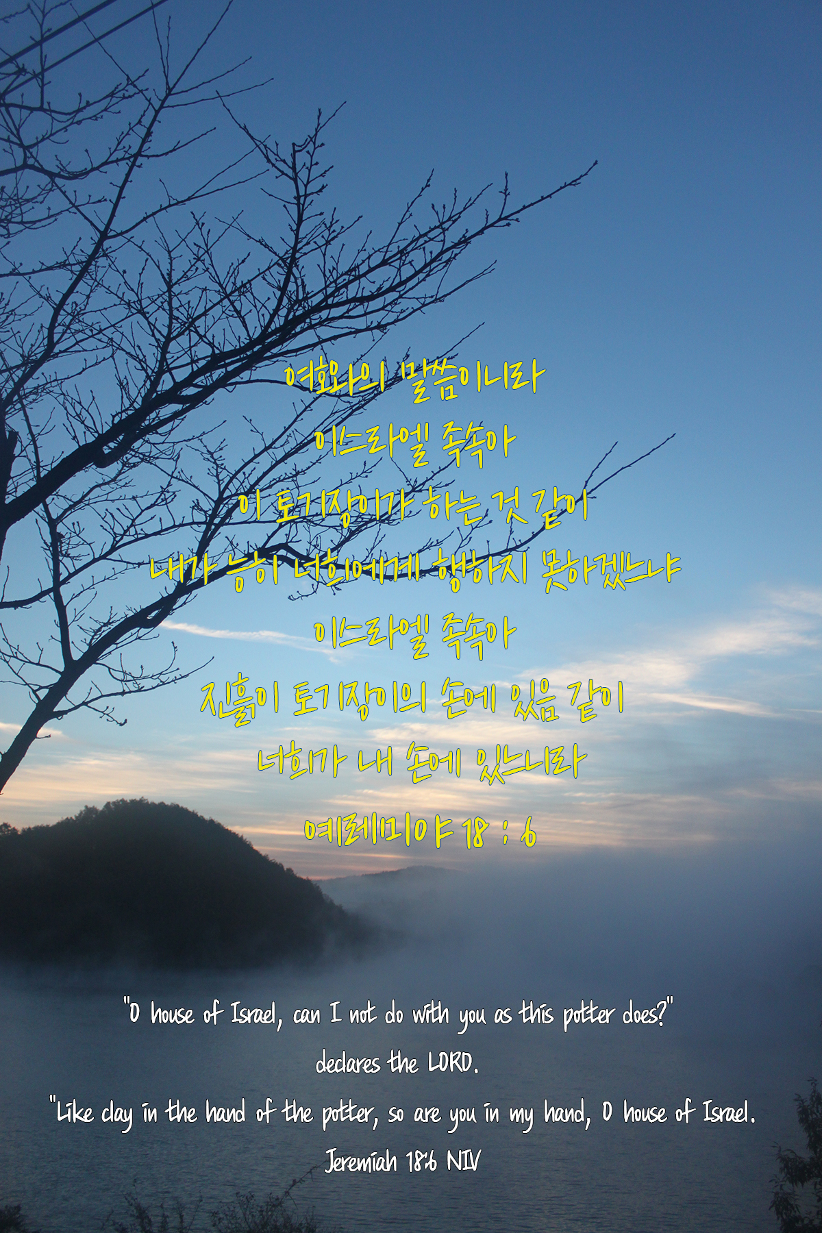 - 여호와의 말씀이니라 이스라엘 족속아 이 토기장이가 하는 것 같이 내가 능히 너희에게 행하지 못하겠느냐 이스라엘 족속아 진흙이 토기장이의 손에 있음 같이 너희가 내 손에 있느니라