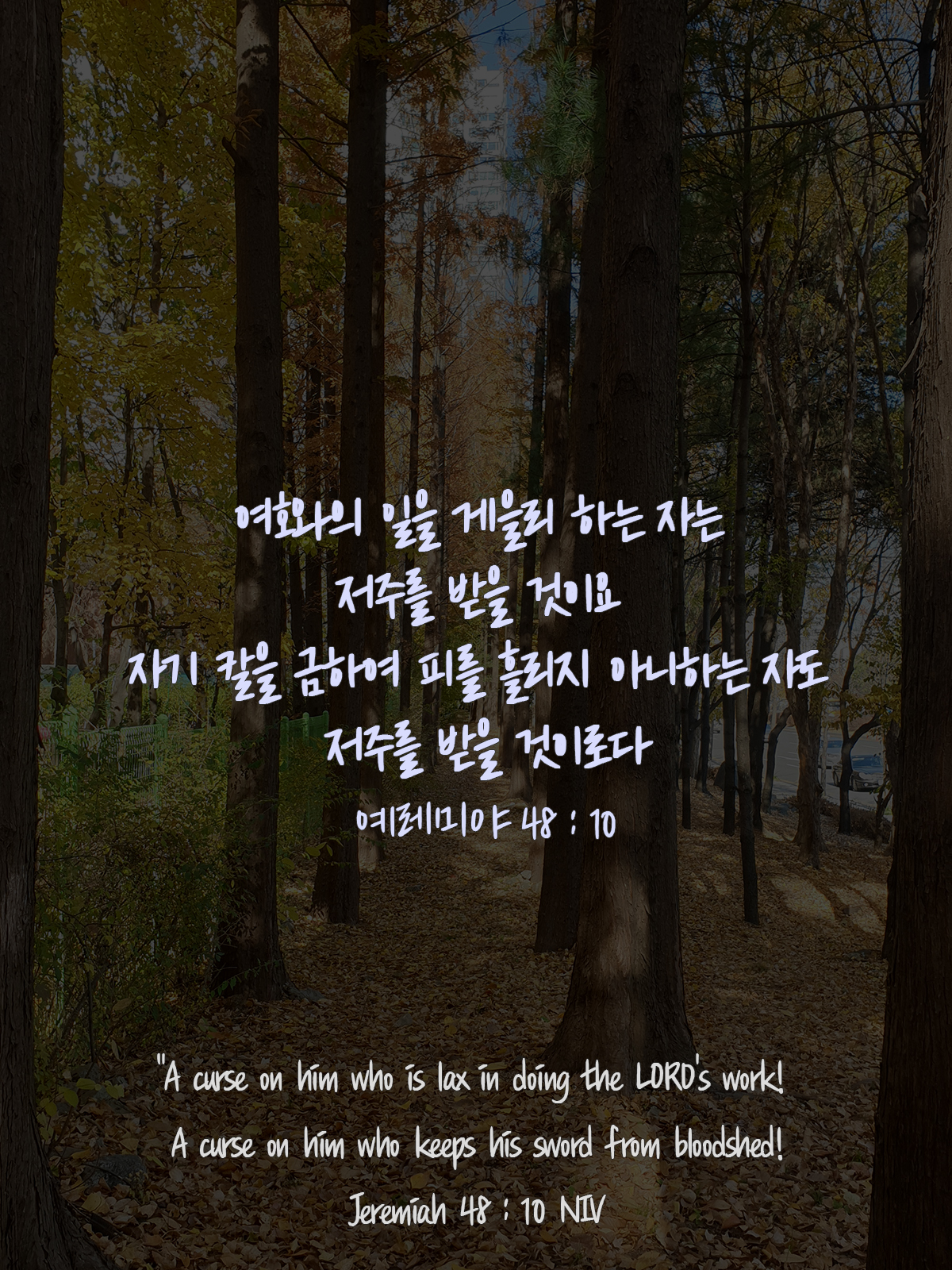 - 여호와의 일을 게을리 하는 자는 저주를 받을 것이요 자기 칼을 금하여 피를 흘리지 아니하는 자도 저주를 받을 것이로다