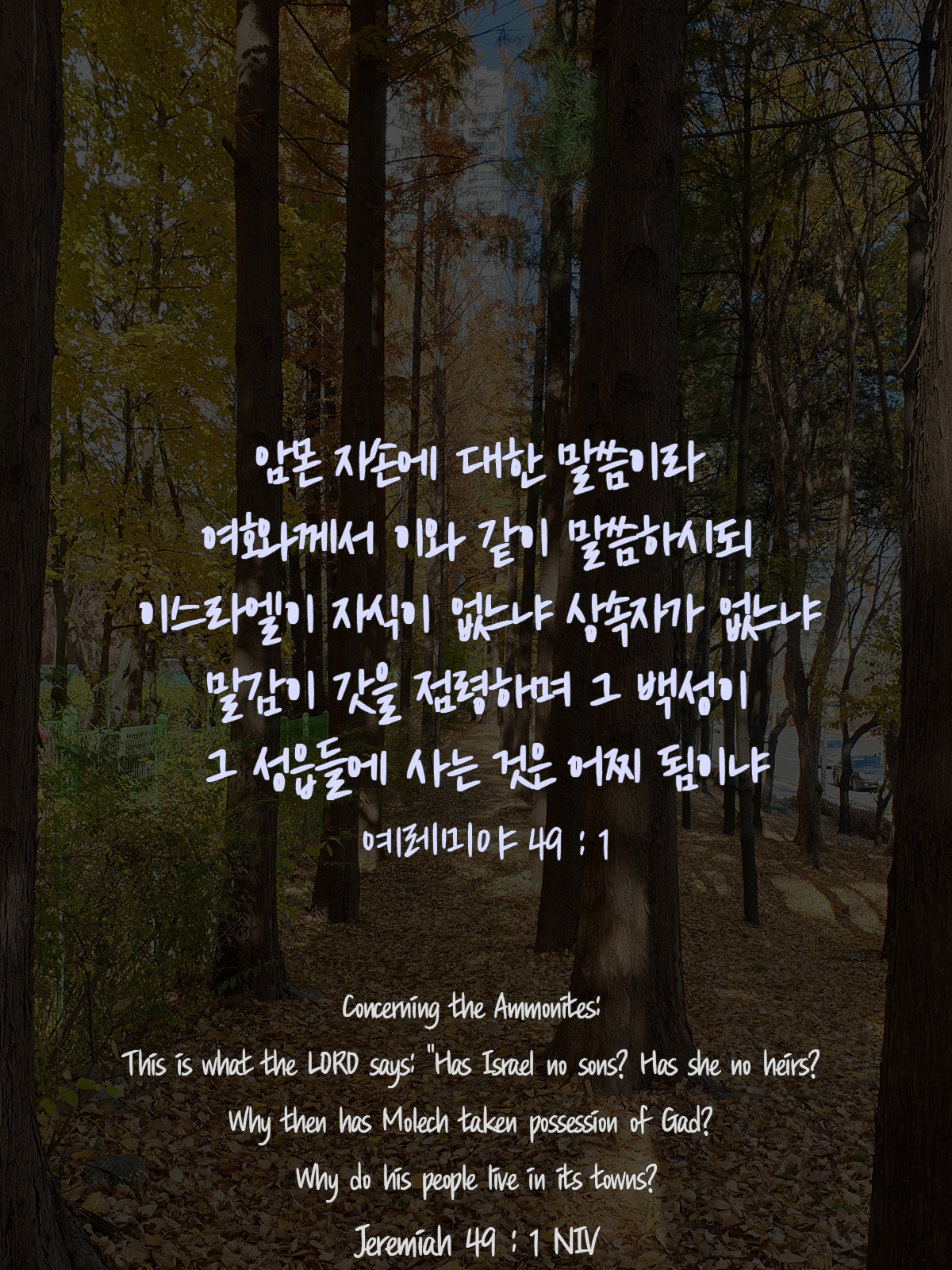 - 암몬 자손에 대한 말씀이라 여호와께서 이와 같이 말씀하시되 이스라엘이 자식이 없느냐 상속자가 없느냐 말감이 갓을 점령하며 그 백성이 그 성읍들에 사는 것은 어찌 됨이냐