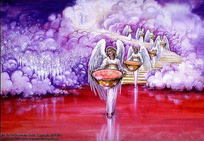 - 일곱 재앙을 가진 일곱 천사가 성전으로부터 나와 맑고 빛난 세마포 옷을 입고 가슴에 금 띠를 띠고