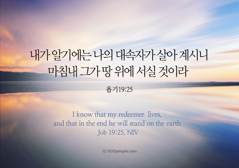- 내가 알기에는 나의 대속자가 살아 계시니 마침내 그가 땅 위에 서실 것이라