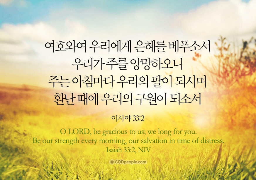 - 여호와여 우리에게 은혜를 베푸소서 우리가 주를 앙망하오니 주는 아침마다 우리의 팔이 되시며 환난 때에 우리의 구원이 되소서