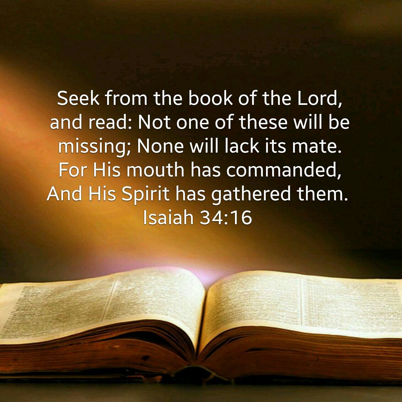 16. 너희는 여호와의 책에서 찾아 읽어보라 이것들 가운데서 빠진 것이 하나도 없고 제 짝이 없는 것이 없으리니 이는 여호와의 입이 이를 명령하셨고 그의 영이 이것들을 모으셨음이라