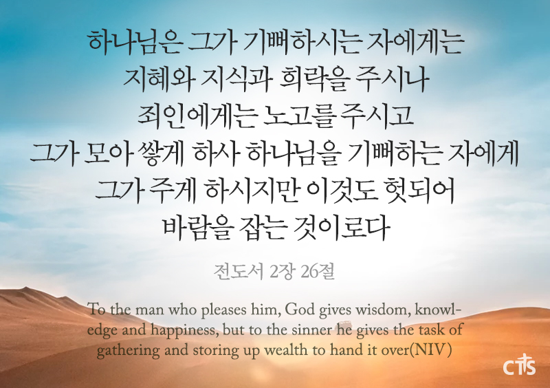 - 하나님은 그가 기뻐하시는 자에게는 지혜와 지식과 희락을 주시나 죄인에게는 노고를 주시고 그가 모아 쌓게 하사 하나님을 기뻐하는 자에게 그가 주게 하시지만 이것도 헛되어 바람을 잡는 것이로다