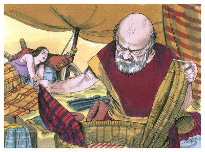 34 라헬이 그 드라빔을 가져 낙타 안장 아래에 넣고 그 위에 앉은지라 라반이 그 장막에서 찾다가 찾아내지 못하매