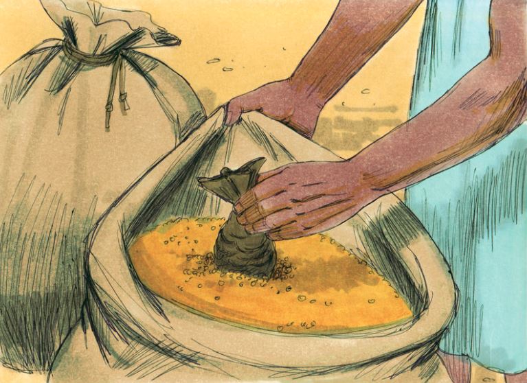 27 한 사람이 여관에서 나귀에게 먹이를 주려고 자루를 풀고 본즉 그 돈이 자루 아귀에 있는지라