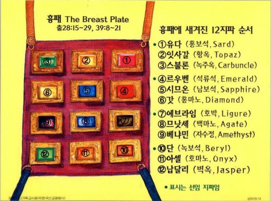 21 이 보석들은 이스라엘 아들들의 이름대로 열둘이라 보석마다 열두 지파의 한 이름씩 도장을 새기는 법으로 새기고